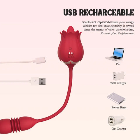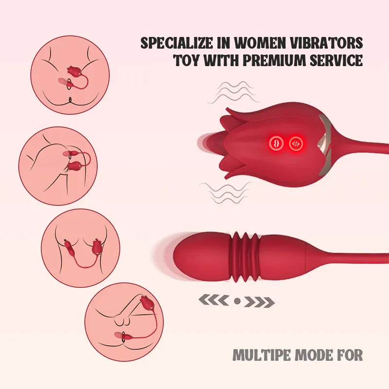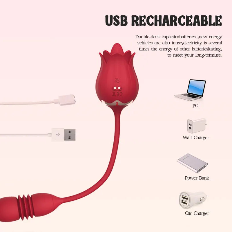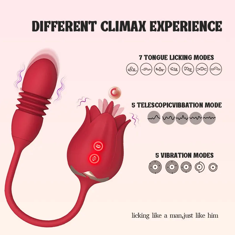 Indulge in a sensory masterpiece with the Rose Vibrator, designed to deliver three incredible sensations—tongue licking, thrusting, and vibration—for an all-encompassing pleasure experience.